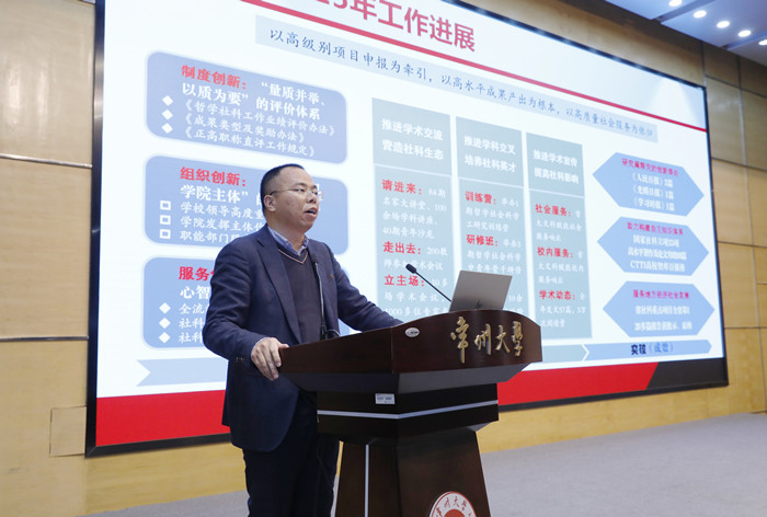 徐守坤在总结讲话中高度评价了本次大会所展现出的求真务实学术品格和真抓实干奋进姿态,充分肯定了一年来学校哲学社会科学工作在项目、成果等方面取得的突破,并向在2025年哲学社会科学工作中取得突出成绩的老师及集体表示热烈祝贺。他指出,学校文科的发展与学校发展目标紧密联系在一起,为学校形成“特色鲜明”和入选省高水平大学建设序列提供了重要支撑。面向“十五五”,学校文科要继续为“领军型大学”建设贡献力量。他强调,每位老师的成功就是大学的成功,学校将全力完善政策、搭建平台、营造氛围,为每一位奋斗者保驾护航,让常州大学成为人才干事创业的热土。
